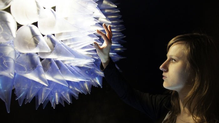 Een lamp die je kan laten schrikken. Het moet niet gekker worden. Fiet is opgebouwd uit honderden kegels en reageert op geluid. Fiet is gestressed wanneer er plotseling een hard geluid klinkt, maar...