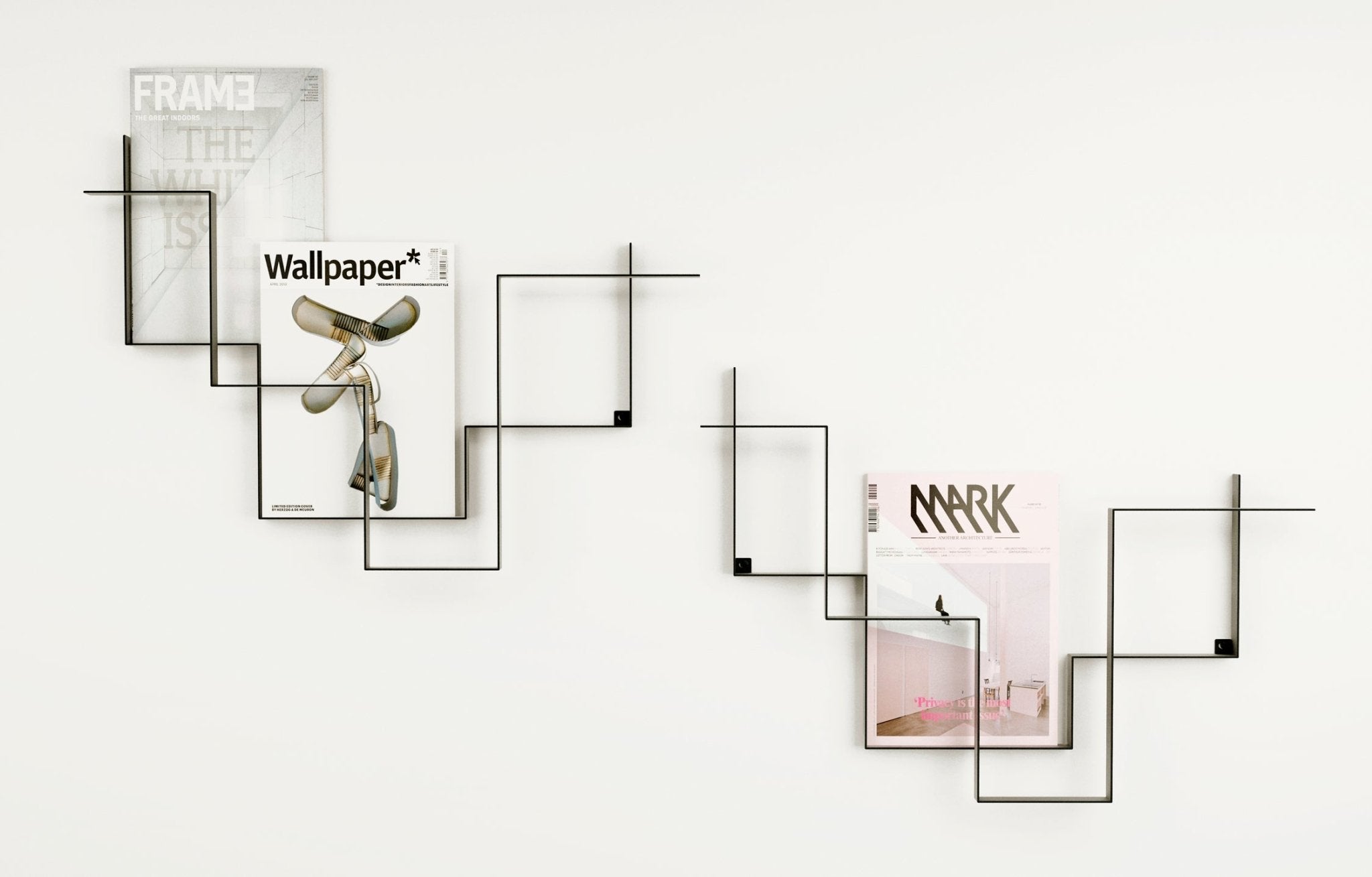 Guidelines van de hand van Frederik Roijé is in de eerste plaats een tijdschriftenrek. Twee gebogen, metalen frames zijn op elkaar geplaatst en vormen zo een geometrisch lijnenspel.Je kunt de ‘Guid...